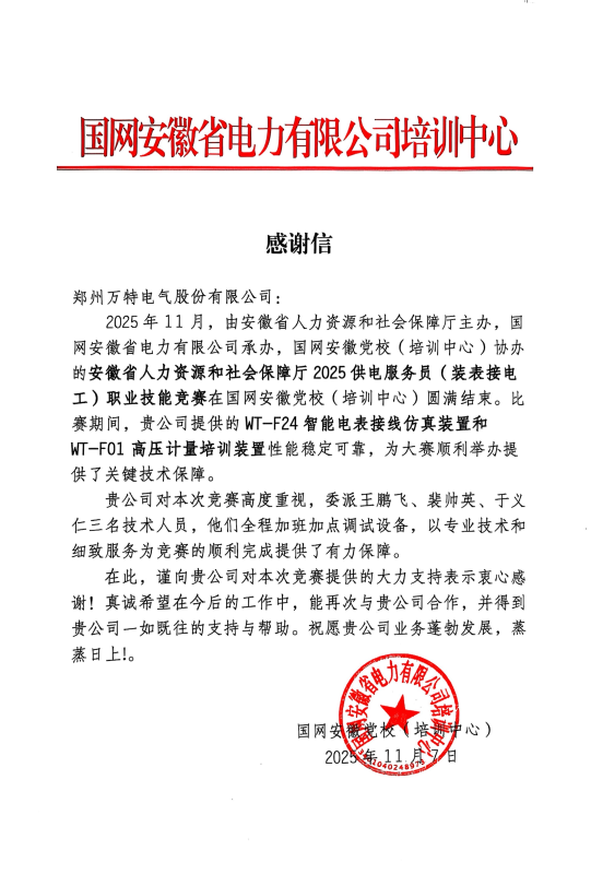 “比賽期間,貴公司提供的WT-F24智能電表接線仿真裝置和WT-F01高壓計量培訓裝置性能穩(wěn)定可靠,為大賽順利舉辦提供了關鍵技術保障。